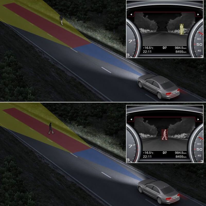 Kit för installation av original night-vision i Audi A6 / A7 / A8. Night vision-paketet detekterar fotgängare med hjälp av den integrerade värmekameran och varnar föraren för fotgängare/djur på vägen ca 100m framför bilen genom bilens instrumenthus. Även kompatibelt med befintlig headup-display.