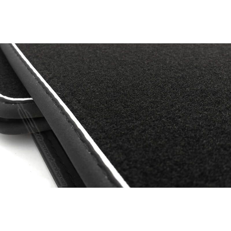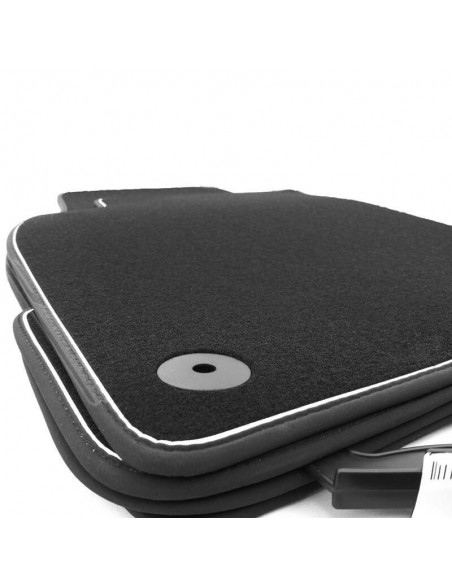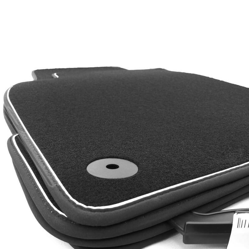 Komplett uppsättning av svarta tyg/velour-mattor med silverdetalj Audi A4 / S4 / RS4 (B6, B7). Tygmattor av högsta kvalité med Filzgrip-undersida ger halkfria & vattentäta mattor. Skräddarsydda och modellanpassade mattor med fästen för ersättning av bilens originalmattor. Speciellt framtaget velour-tyg som gör det lätt att hålla rent och tvätta, tål även våt-tvätt