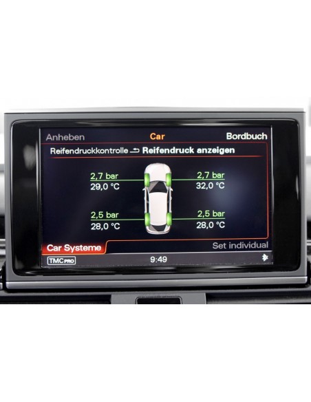 Kit för eftermontering av original Tire Pressure Monitoring System (TPMS) / däcktrycksövervakning i Audi A6, A7 4G. Individuell visning av däcktryck samt temperatur i bilens fyra däck, direkt i bilens befintliga radio-/navigation samt instrumenthus. Kittet levereras komplett med 4st sensorer samt bilspecifikt kablage för installation.