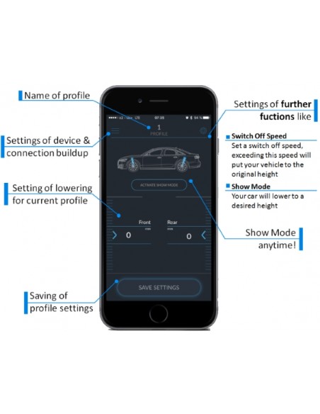 Active Suspension Control för sänkning av Porsche Cayenne III med luftfjädring (Adaptive Air Suspension). Plug n' play-kit som låter dig styra luftfjädringen via app i din smartphone. Ställ enkelt & steglöst in sänkning via bluetooth i din smartphone. Levereras utan installationsmanual, montering rekommenderas via professionell verkstad.
