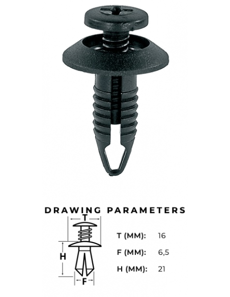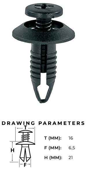 Clips av plast som används i bl.a. LEXUS, JEEP, FORD, FIAT, DAEWOO, CITROEN, CHRYSLER, CHEVROLET, BMW, AUDI, ACURA, MERCEDES-BENZ, MAZDA, MITSUBISHI, NISSAN, HONDA, HYUNDAI, VOLVO, VOLKSWAGEN, TOYOTA, SUZUKI, SUBARU, SKODA, SEAT, SAAB, RENAULT, PEUGEOT, OPEL. Används främst för stötfångare, hjulhus, dekorlister, kaross och dörrar.