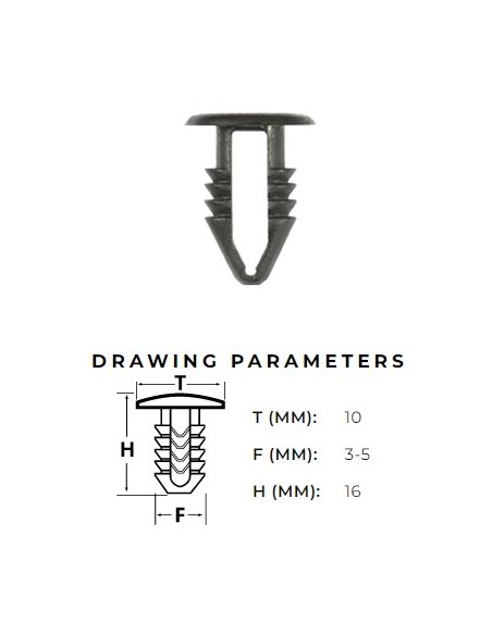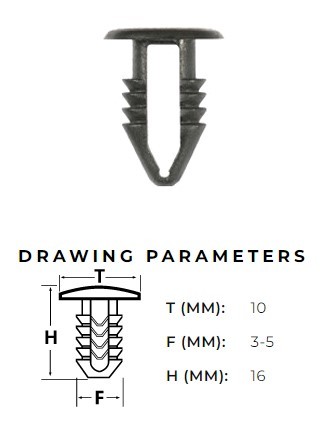 Clips av plast som används i bl.a. LEXUS, FORD, FIAT, JEEP. Används universellt främst för motorhuv, dörrar och lister.